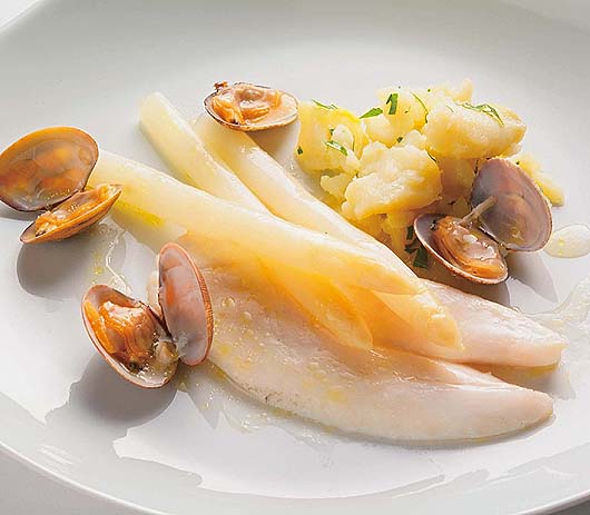 マトウ鯛のヴァプール アサリの白ワイン蒸しとホワイトアスパラガス添え シェフマルシェ